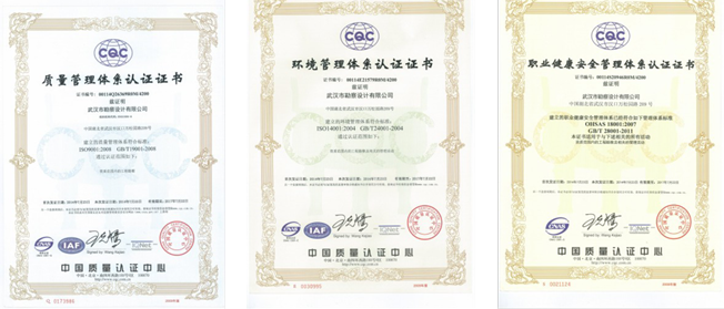 2014年7月23日,經(jīng)中國CQC質(zhì)量認證中心審核認定,武漢市勘察設(shè)計有限公司取得質(zhì)量、環(huán)境、職業(yè)健康安全三標體系證書。