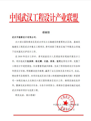 2019年1月21日,中國武漢設(shè)計產(chǎn)業(yè)聯(lián)盟向我司發(fā)來感謝信,對漢口濱江國際商務(wù)區(qū)基坑支護設(shè)計項目組成員一年來辛勤而卓有成效的工作表示感謝,這封感謝信代表了設(shè)計產(chǎn)業(yè)聯(lián)盟對我司設(shè)計工作的充分認可。
