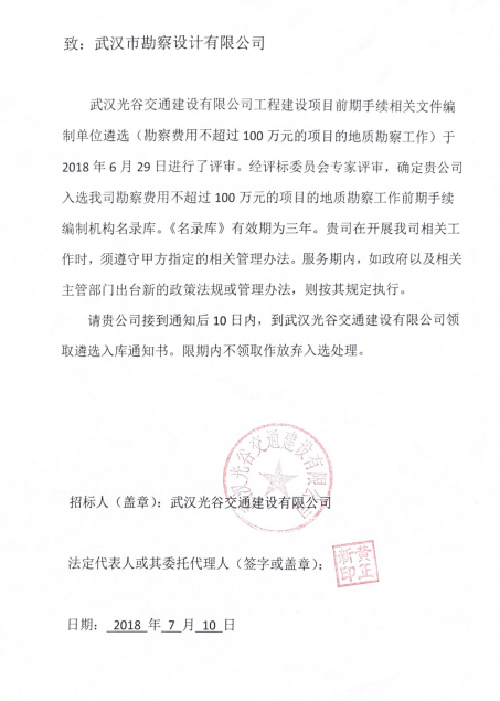 2018年6月29日,經(jīng)投標(biāo),我公司成功入選武漢光谷交通建設(shè)有限公司勘察費(fèi)用不超過100萬元的項(xiàng)目地質(zhì)勘察工作,服務(wù)期限為三年。 武漢光谷交通建設(shè)有限公司主要業(yè)務(wù)范圍為城市地鐵、有軌電車、公交系統(tǒng)等公共交通項(xiàng)目的建設(shè)、運(yùn)營管理;重大交通建設(shè)項(xiàng)目、重大...